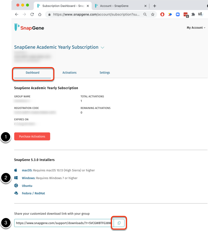 管理 SnapGene 帐户:仪表板